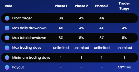 - Profit Target – Traders must achieve a designated profit percentage to successfully conclude an evaluation phase, withdraw earnings, or scale their trading account. The profit target for Phase 1 is set at 8%, whereas Phase 2 and Phase 3 require reaching a profit target of 4%. Funded accounts do not have any specified profit targets.