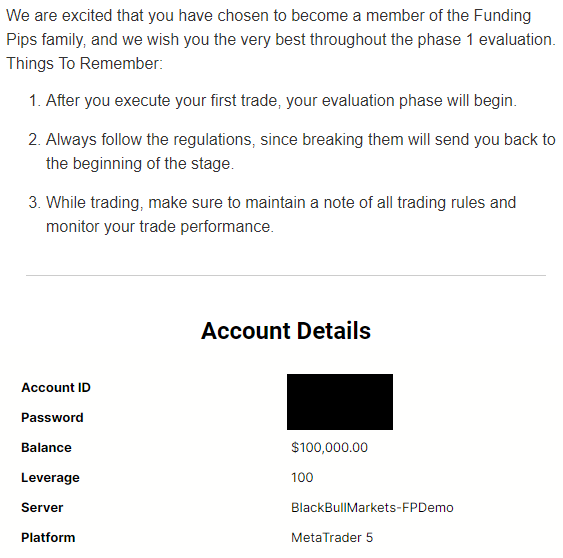 Receive Login Credentials – Find an email with a greeting from FundingPips, where you can access your login credentials for your newly purchased trading account.