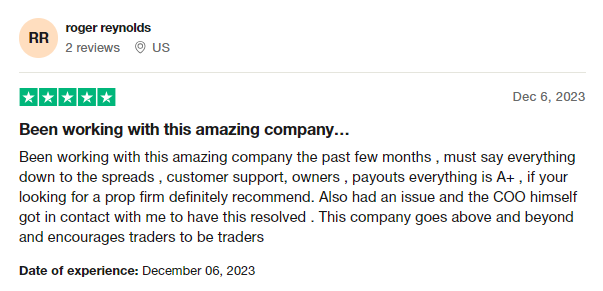 Having collaborated with FundingPips for the past few months, the client expresses utmost satisfaction, rating everything from spreads and customer support to the owners and payouts as A+. They highly recommend FundingPips for those seeking a prop firm. The client highlights the exceptional level of service, noting that even when faced with an issue, the COO personally reached out to ensure a resolution. FundingPips is commended for going above and beyond, fostering an environment that encourages traders to excel in their craft.