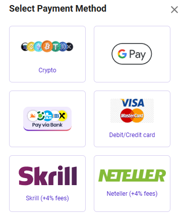 Choose Your Payment Method – Choose between a credit/debit card, Google Pay, Skrill, Netellet, and a cryptocurrency payment method.