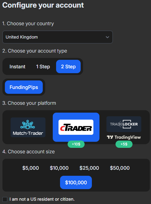 Choose Your Account – Choose your country, account type, trading platform, and account size.