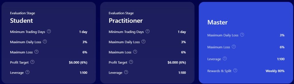 FundingPips believes that traders undergo three essential stages during their professional development, Student, Practitioner, and Master. Traders have the opportunity to earn substantial profits, with the flexibility to manage account sizes up to $100,000 and receive up to 100% profit splits. This can be accomplished through trading various financial instruments, including forex pairs, commodities, indices, and cryptocurrencies.